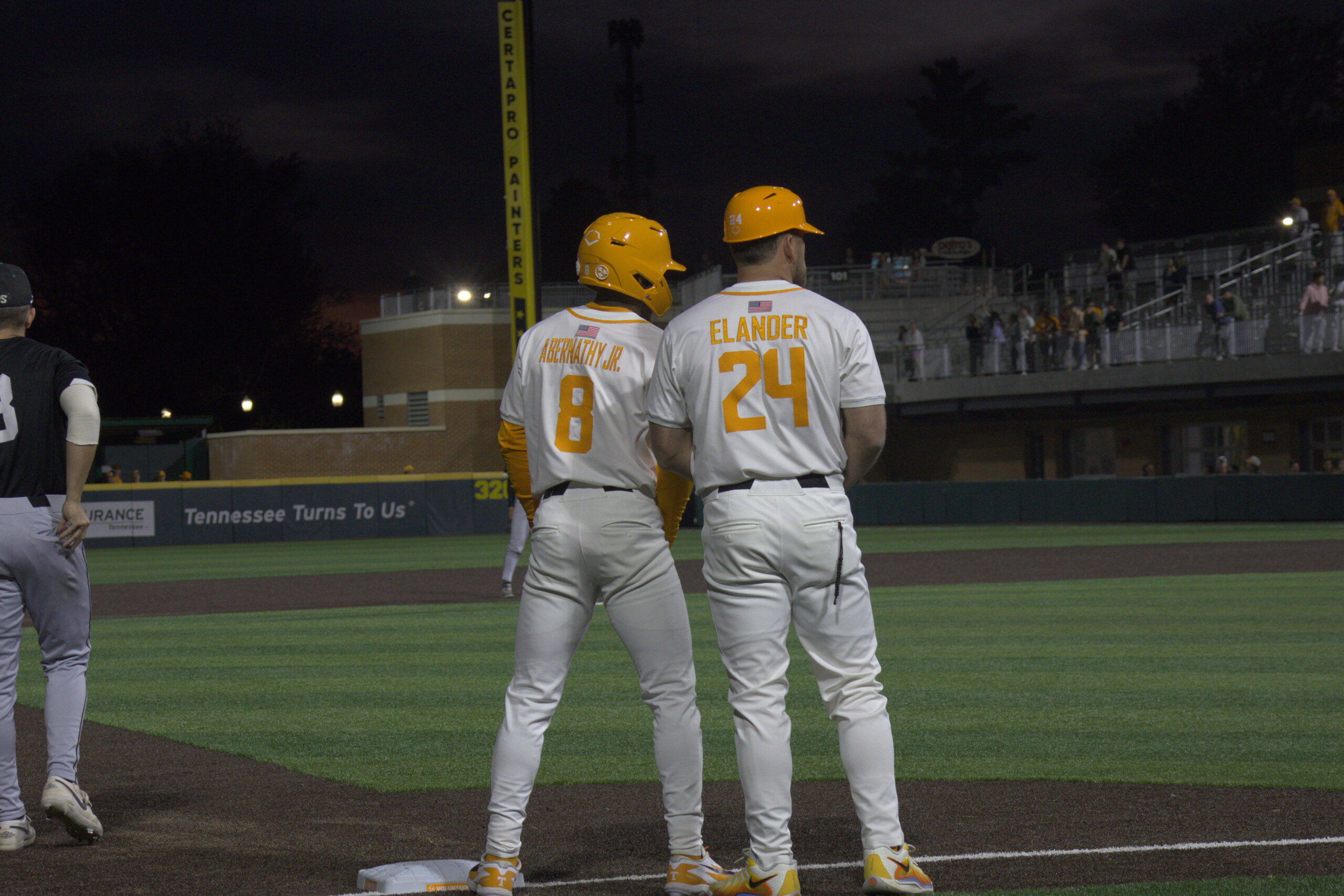 By Lily Helton Tennessee pinch runner Jay Abernathy (8) and head coach Josh Elander (24) speak on third base during a game versus Tennessee Tech inside Lindsey Nelson Stadium | Tuesday, March 24, 2026 | Lauryn Gempler/The Volunteer Channel Blake Grimmer steps up to the plate at the bottom of the ninth inning. All game,…